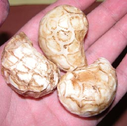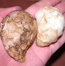 Mustikas are unusual objects formed in animals and plants. They may assume the shape of regular oyster-pearls and tumbled stones or in unusual shapes and sizes. In their unpolished /untumbledstate, they have a rough texture. Unlike oysters that form pearls out of irritation, Nature forms these pearls in the bodies of diverse animals, plants and fruits for some reason unknown as yet to us. They are unusual creations that may correspond to human cancers, cysts, and tumors. Not all animals or plants of the same species form these pearls, but they possibly do occur in almost every living being.
